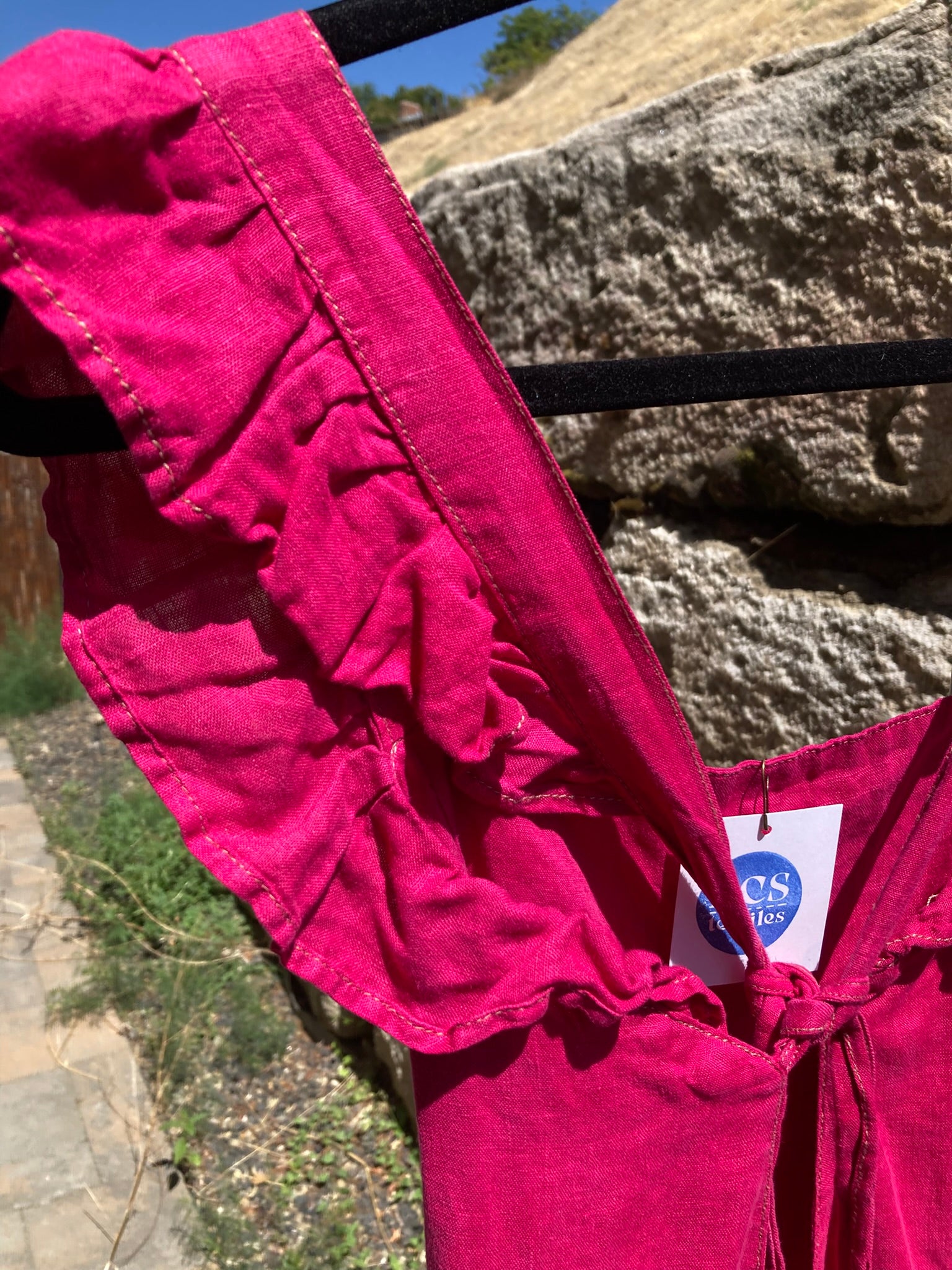 This cute linen jumpsuit has been hand-dyed hit pink with the polyester top stitching remaining a light tan. This jumpsuit has adjustable straps that tie in the back and pockets!