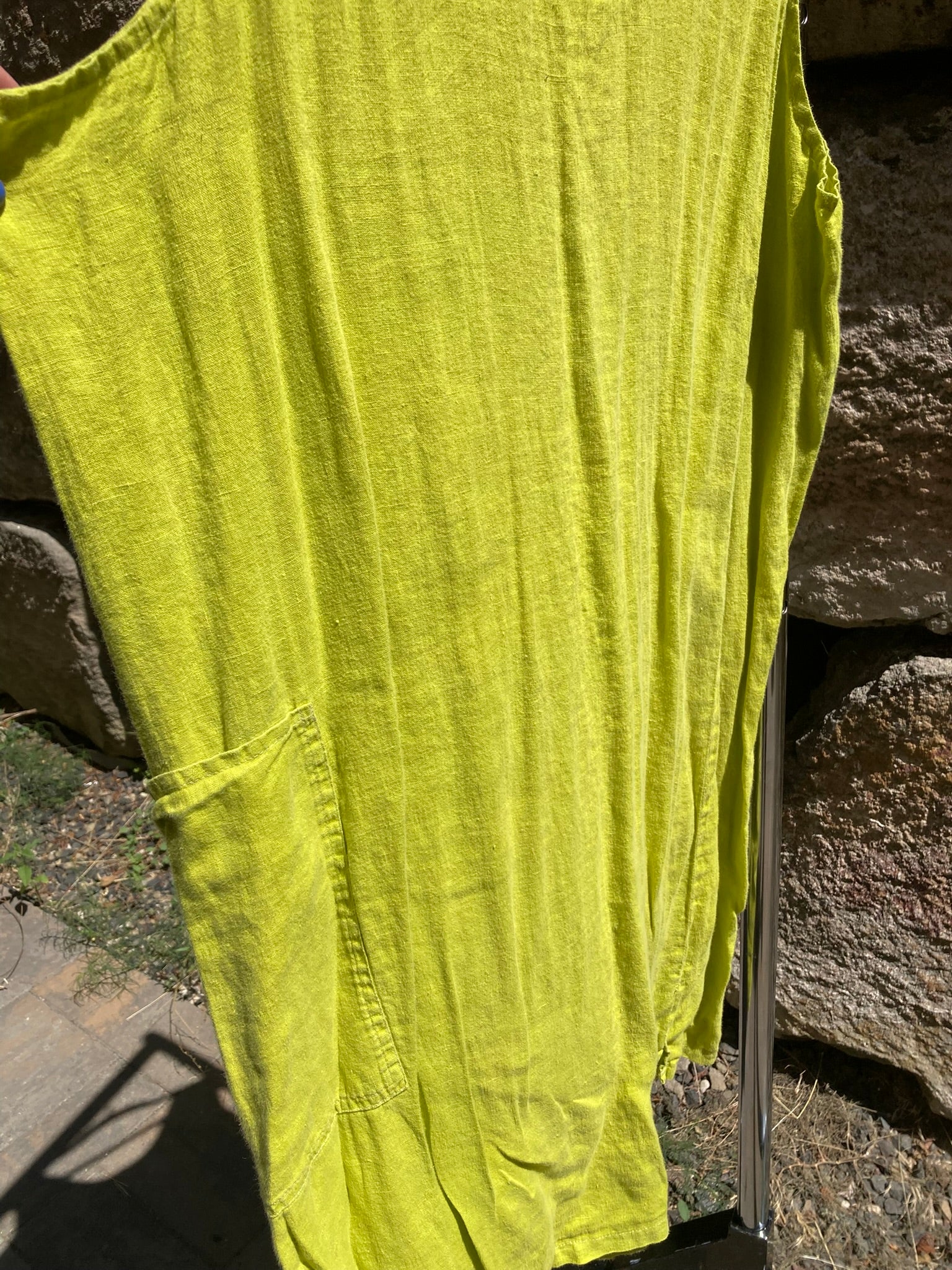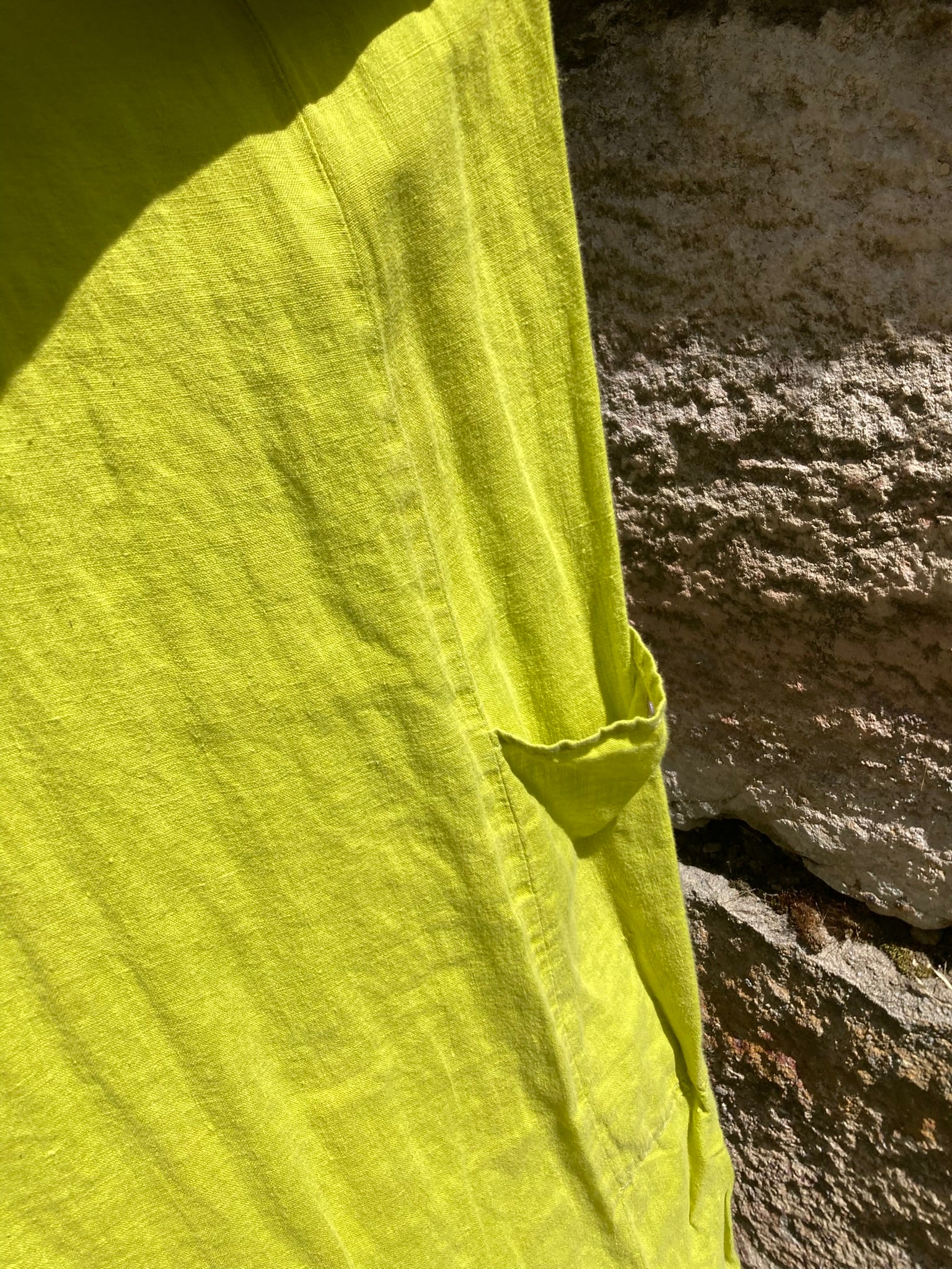 This soft linen dress has been hand-dyed light lime green. There is a pocket on the left side of this dress!
