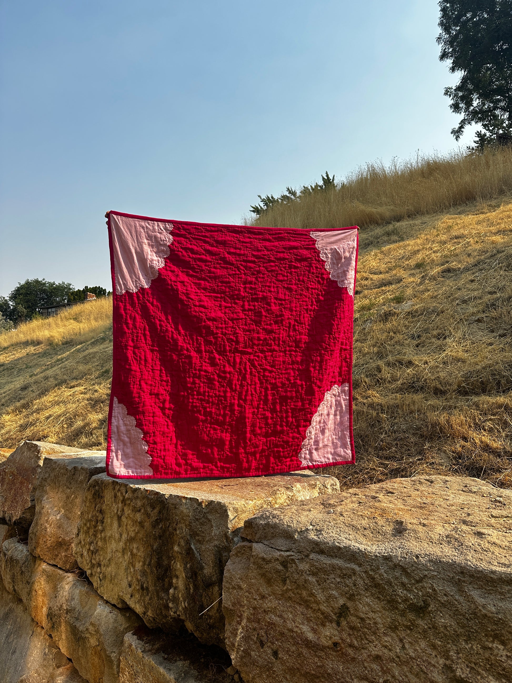 The second quilt in my Modern Vintage series features all linen upcycled fabrics. The backing fabrics are a heavier weight linen hand-dyed hot pink, while the appliqued pieces are a finer linen hand-dyed a very light lavender-pink. The hand quilting and embroidery were done in upcycled crochet cotton hand-dyed hot pink. The applique was hand done with light pink vintage cotton thread. This quilt can function as a lap quilt or large wall hanging at 50" x 50". The two detail shots show the most accurate version of the hot pink color.