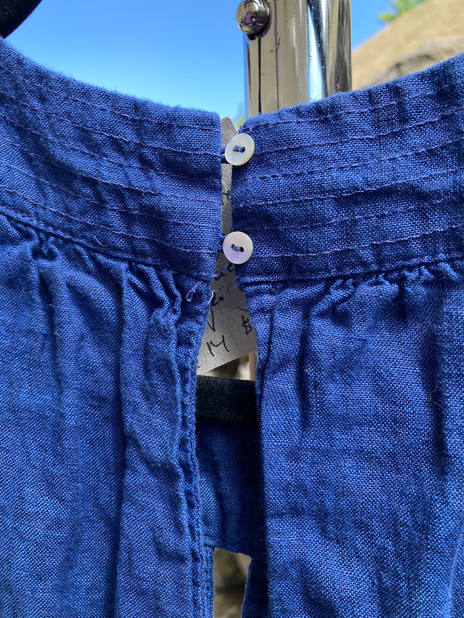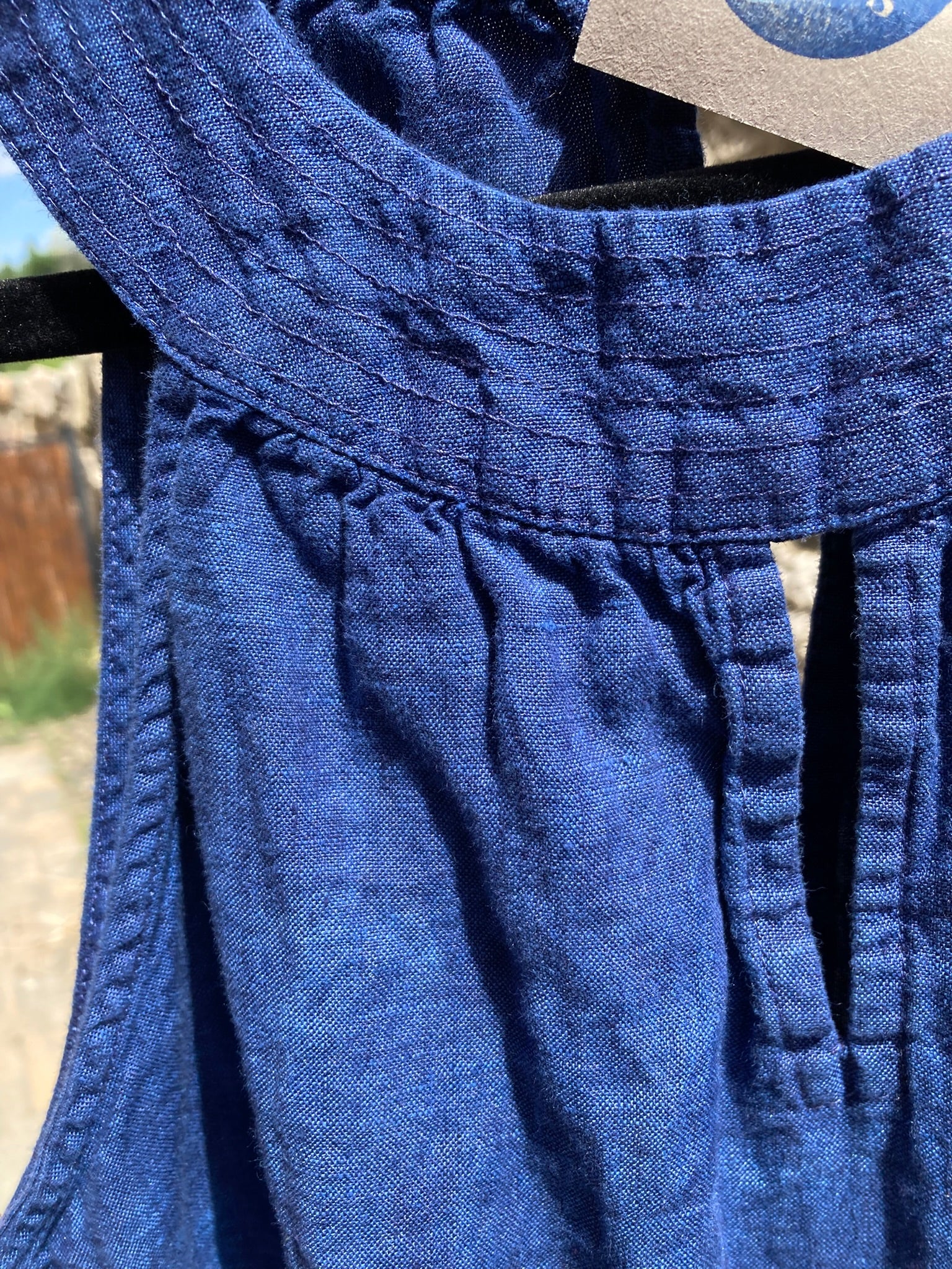 This soft linen dress has been hand-dyed navy blue while the polyester top stitching remains light grey.