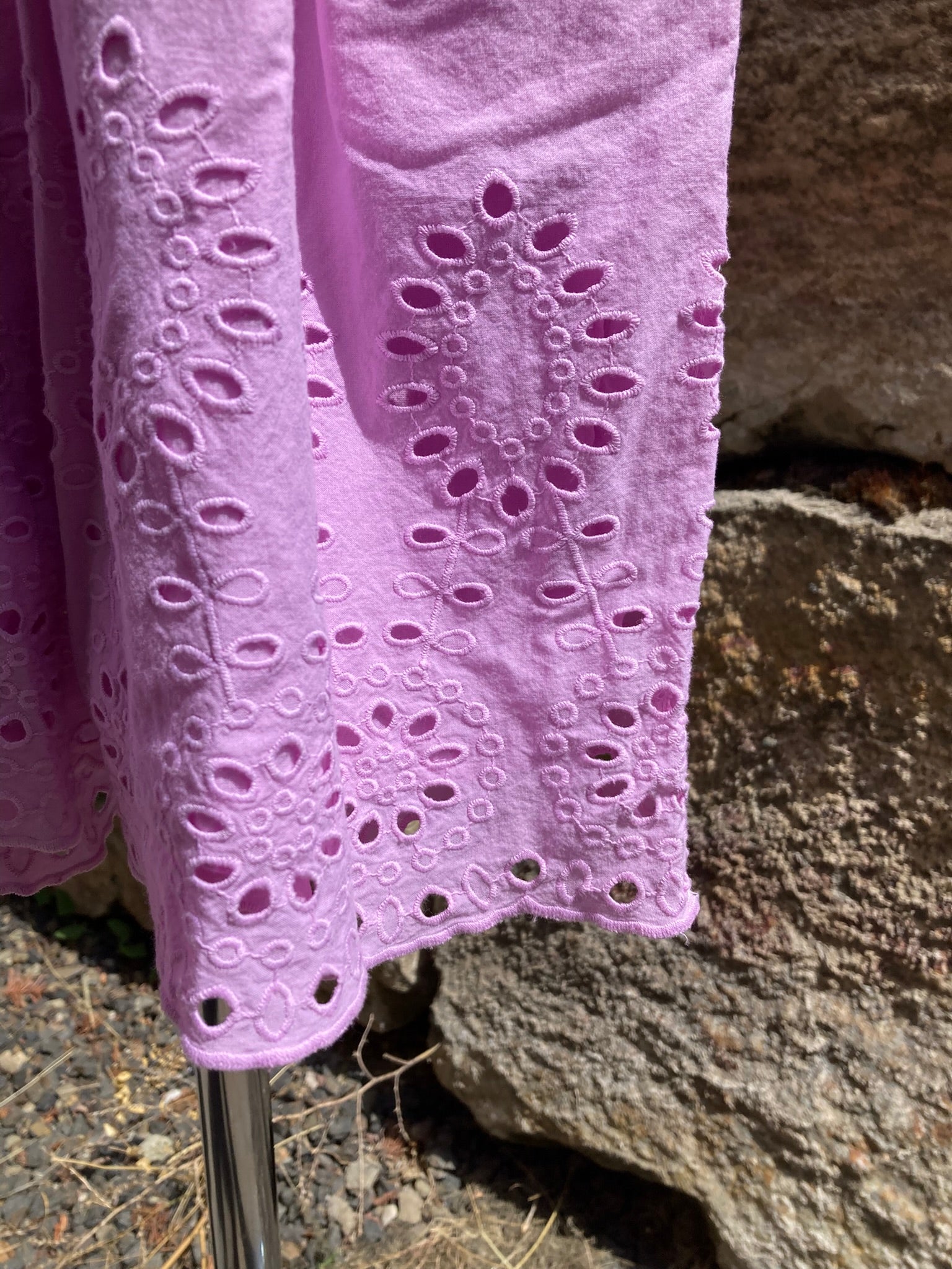 This soft cotton eyelet dress has been hand-dyed sweet pea purple. This dress has pockets!