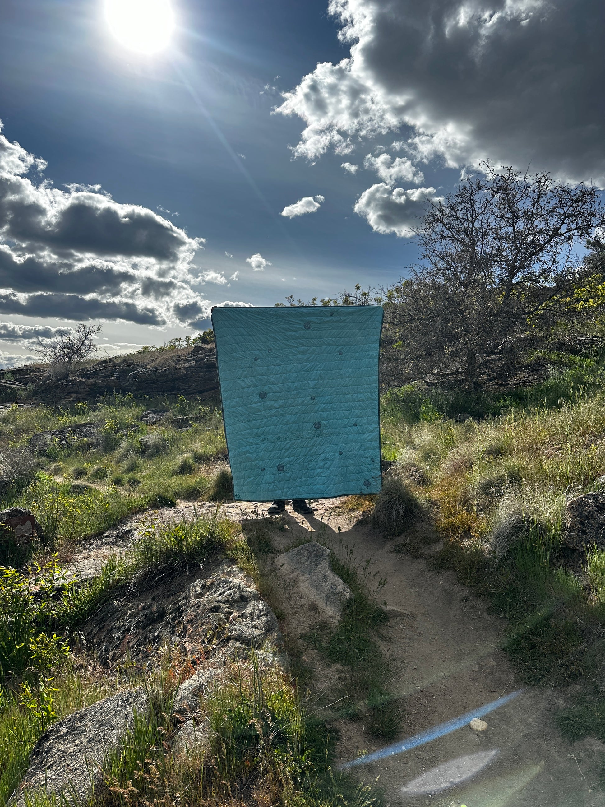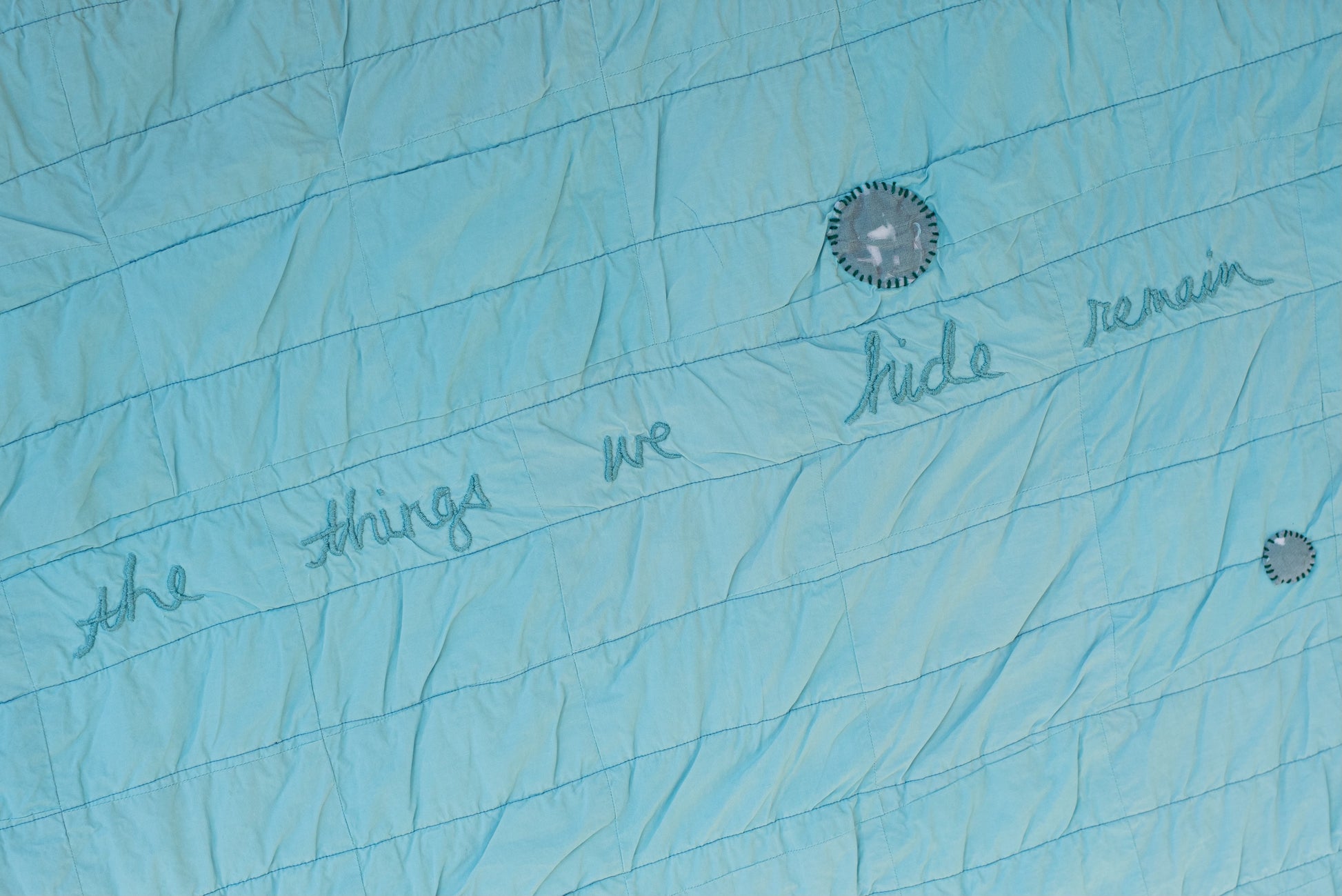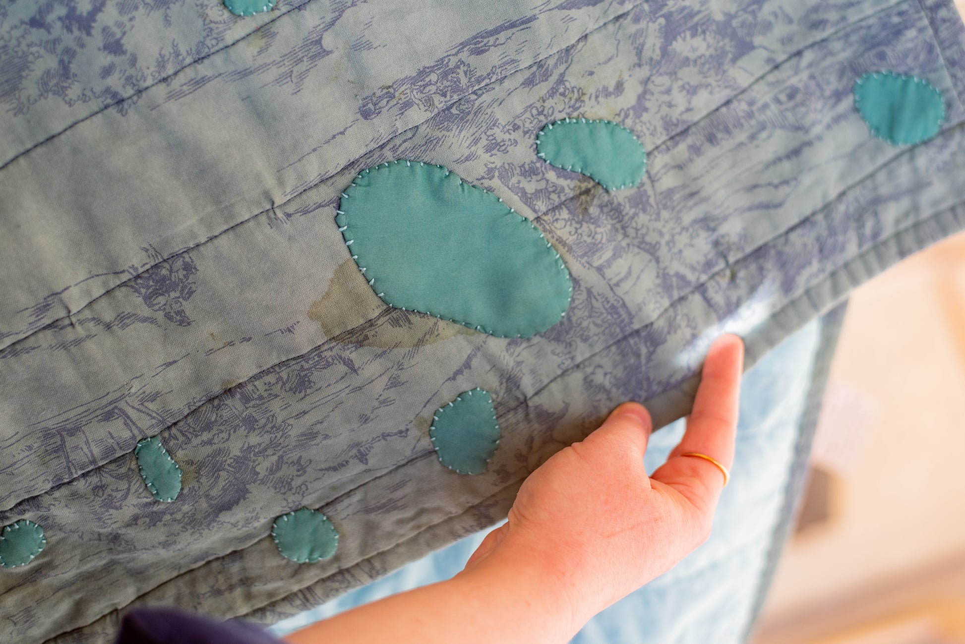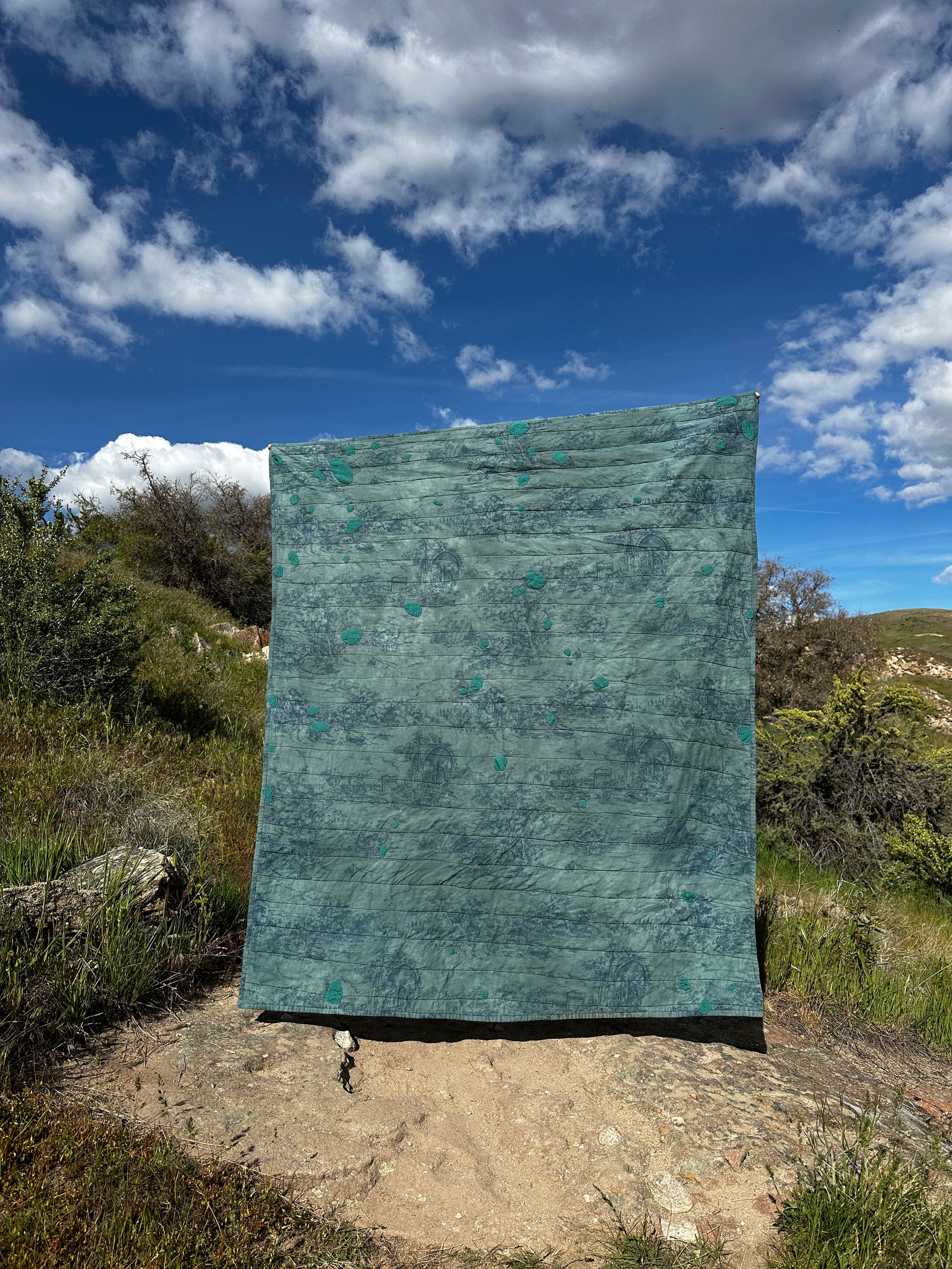 This quilt was inspired by the front fabric, upcycled from an ikea duvet cover which I used for years in its original form before taking apart and dyeing. Though I washed the duvet cover regularly, when I dyed it I found that there had been stains I was not aware of that had reacted to the dye and were more visible than before. I felt intense shame discovering this, linked to ideas about cleanliness and my skill as a dyer, and led me to thinking more and more about what we hide out of shame. I was working on this quilt, feeling and thinking about shame and history, as the Israeli genocide of Palestinians intensified in 2023. As I worked I was thinking of the history of the US, our covert and propagandized relationship with Israel, and all the terrible deeds we try to cover up. So the front of the quilt features small silk patches inadequately covering the stains that remain there, to remind that attempting to hide things leaves them there to fester. The back of the quilt features upcycled cotton pieced irregularly, with more silk patches made from silk organza and the scraps of silk left over from the front, as well as the title of the quilt embroidered in cotton thread the same color as the backing fabric. The batting is cotton and the binding was hand finished on the back of the quilt. This quilt measures 58" x 67".